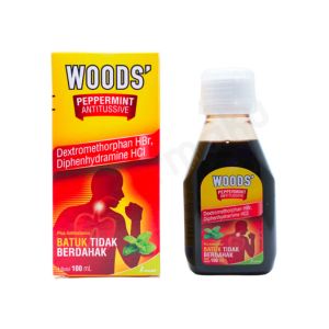 Woods Antitussive adalah obat batuk sirup dengan kandungan dextromethorphan HBr dan diphenhydramine HCl. Kombinasi ini bermanfaat untuk meredakan batuk kering atau batuk tidak berdahak, termasuk batuk akibat alergi.