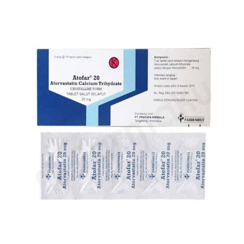 Obat dengan kandungan atorvastatin lainnya adalah Atofar. Biasanya, obat ini diresepkan oleh dokter sebagai pendukung program diet pada kondisi hiperkolesterolemia dan hiperlipidemia.
