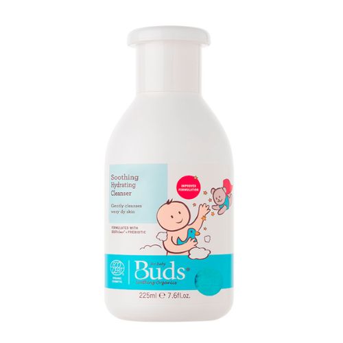 Buds Organics Super Soothing Hydrating Cleanser merupakan sabun bayi yang diformulasikan khusus untuk bayi dengan kulit sangat kering, ruam, eksim, dan biang keringat. Produk ini memiliki dua fungsi, yaitu dapat digunakan sebagai sampo dan sabun sekaligus.