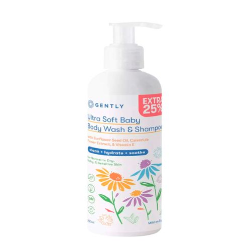 Gently Baby Ultra Soft Body Wash & Shampoo mengandung vitamin E, yang melindungi kulit bayi dari polusi dan radikal bebas. Sabun ini juga dilengkapi dengan sunflower seed oil dan calendula extract, yang menenangkan kulit serta menjaga kelembapan alaminya. Produk ini aman digunakan sejak bayi baru lahir hingga balita.