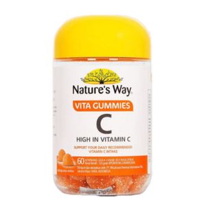 Natures Way Vitamin C berbentuk permen kenyal dengan rasa jeruk yang enak dikonsumsi.
