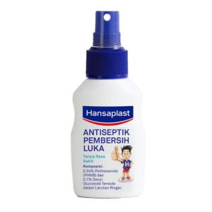 Hansaplast Antiseptik Spray cairan antiseptik yang praktis untuk membersihkan luka ringan dan melindunginya dari risiko kotoran serta bakteri.